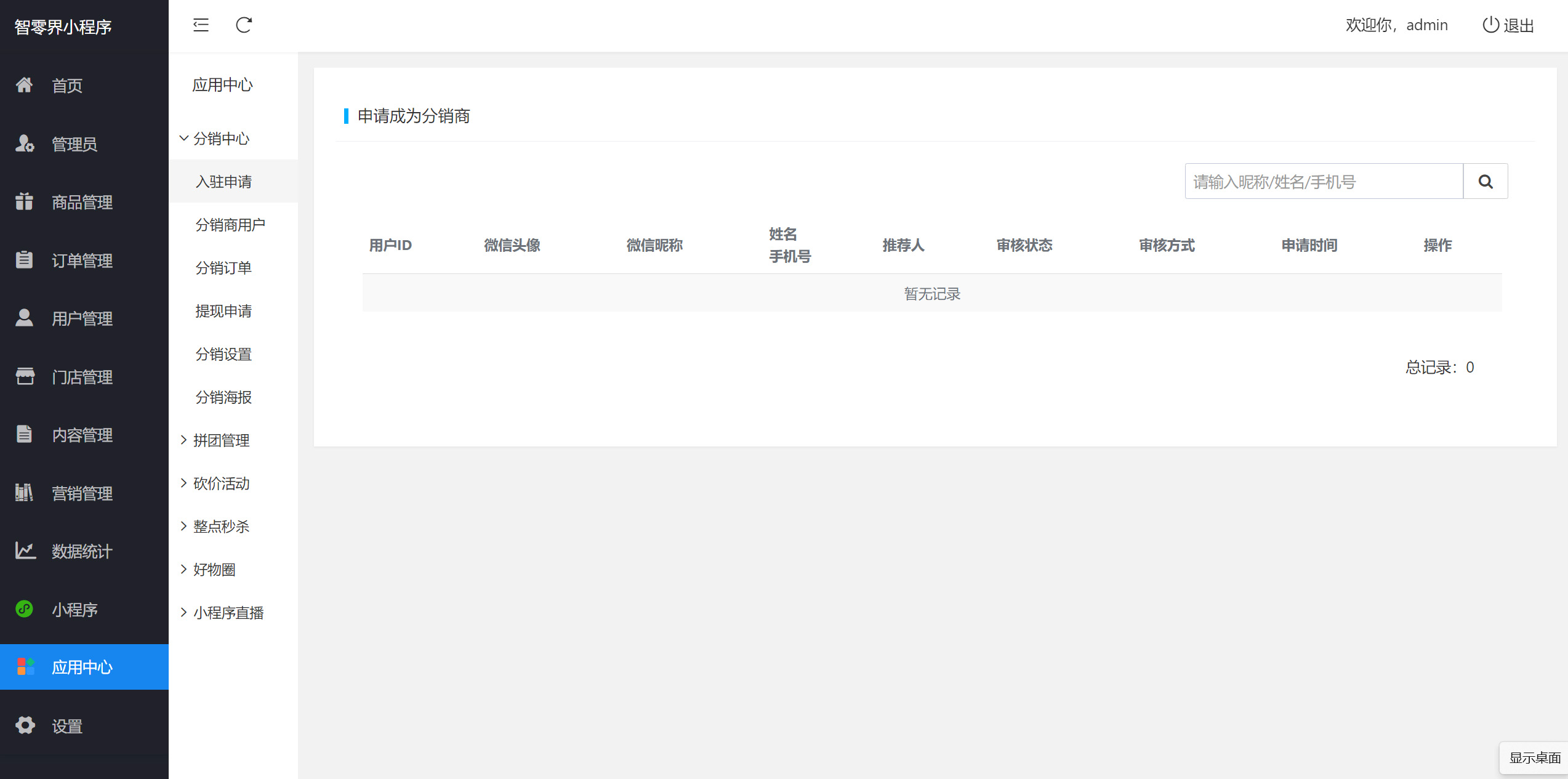 8、应用中心有很多功能,分销及提现、拼团、砍价、整点秒杀、好物圈、小程序直播。