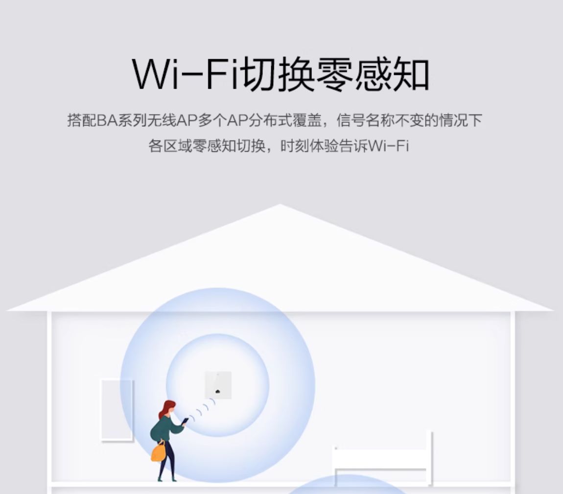 搭配BA系列无线AP多个AP分布式覆盖,信号名称不变的情况下各区域零感知切换,时刻体验告诉Wi-Fi