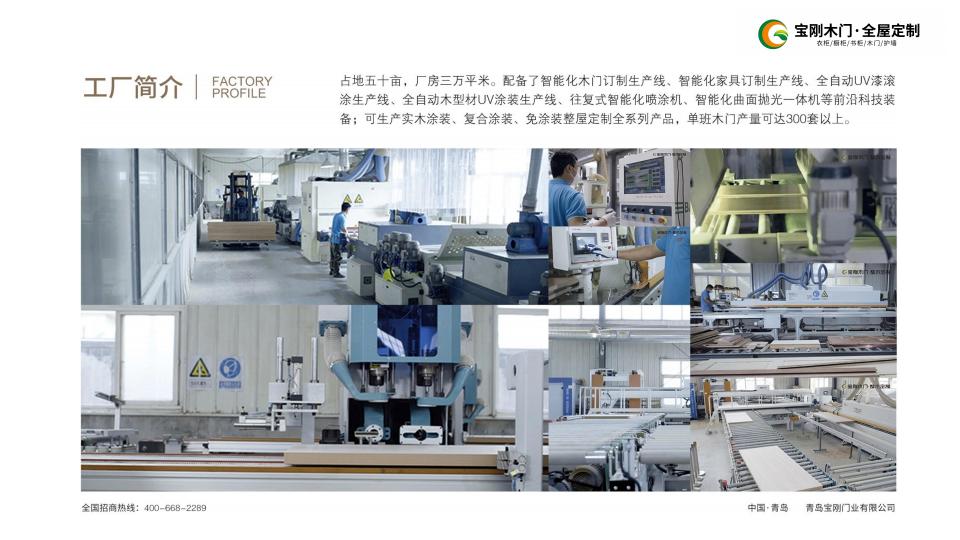 公司占地五十亩,拥有三万平米的厂房,引进多条智能化生产线,专注于实木涂装、复合涂装及免涂装整屋定制,日产木门超过300套。宝刚坚持“以人为本”的管理原则和“技术为先”的创新策略,不断推动产品和服务的升级,确保品质与市场领先地位。