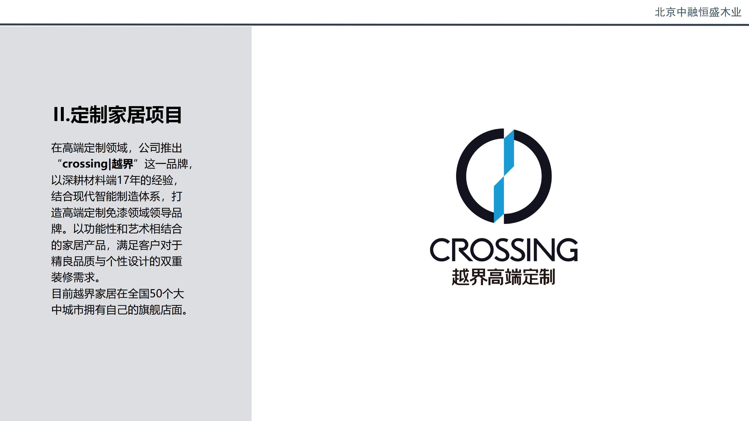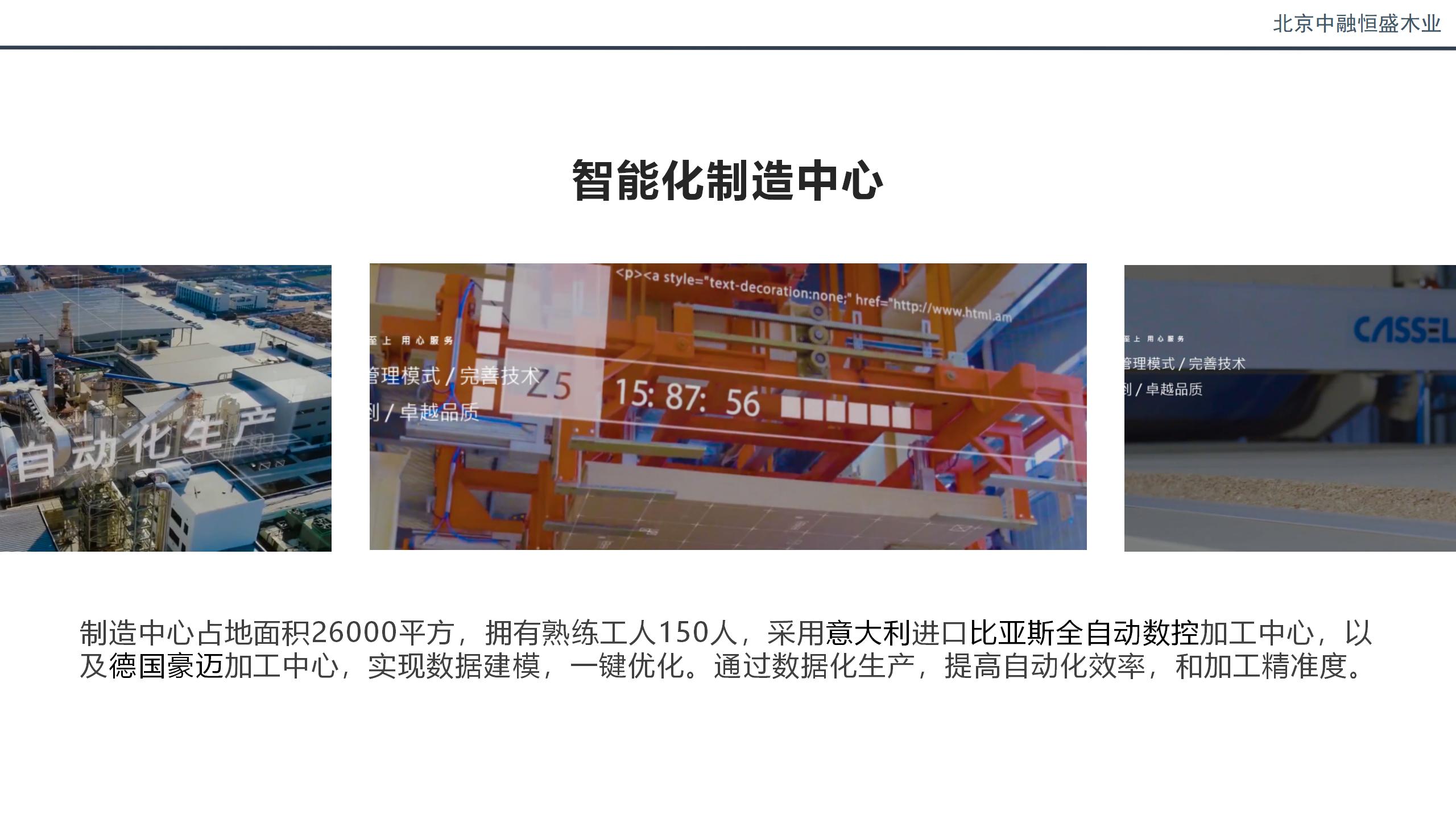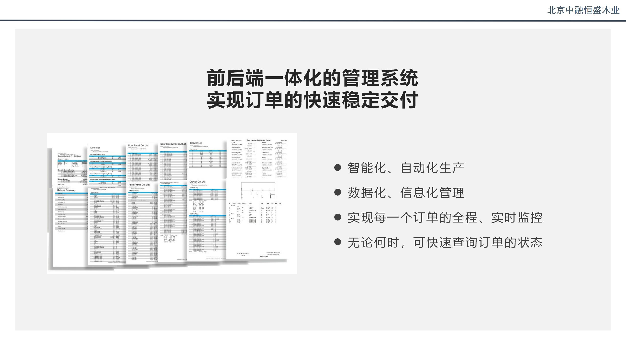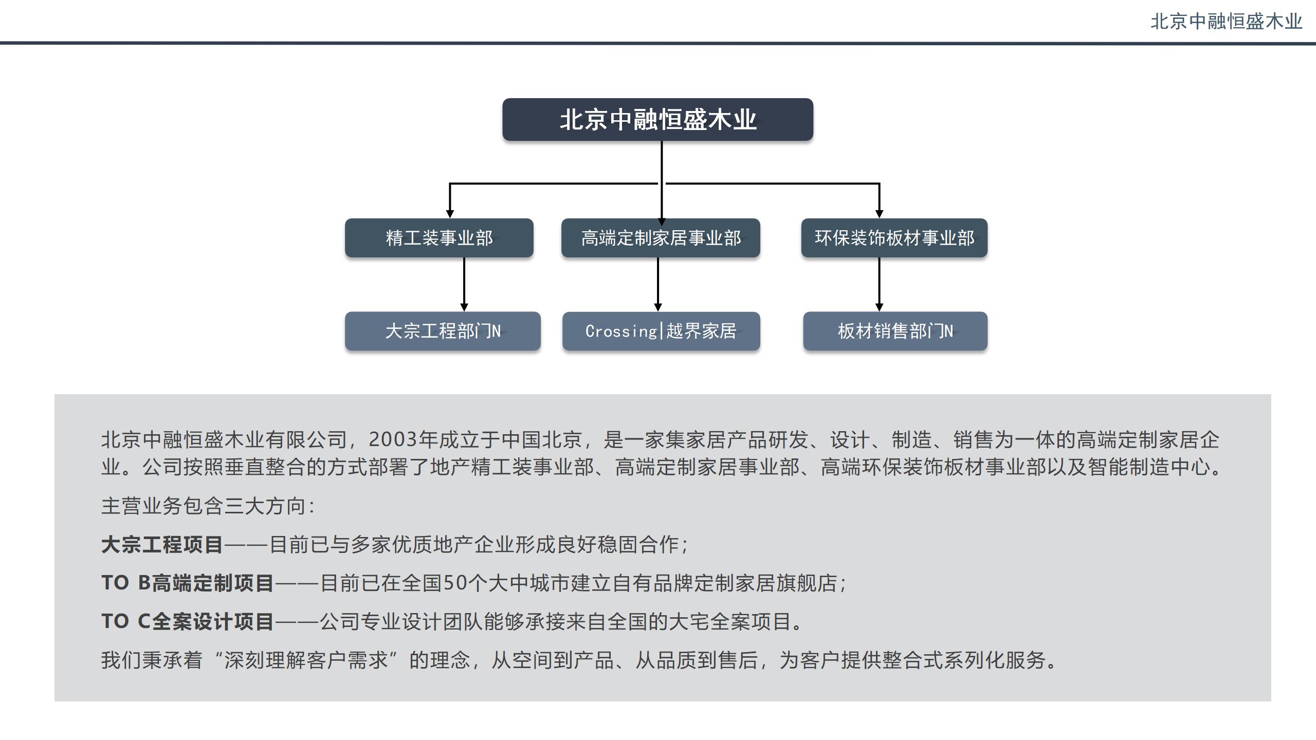 北京中融恒盛木业有限公司,2003年成立于中国北京,是一家集家居产品研发、设计、制造、销售为一体的高端定制家居企业。公司按照垂直整合的方式部署了地产精工装事业部、高端定制家居事业部、高端环保装饰板材事业部以及智能制造中心。