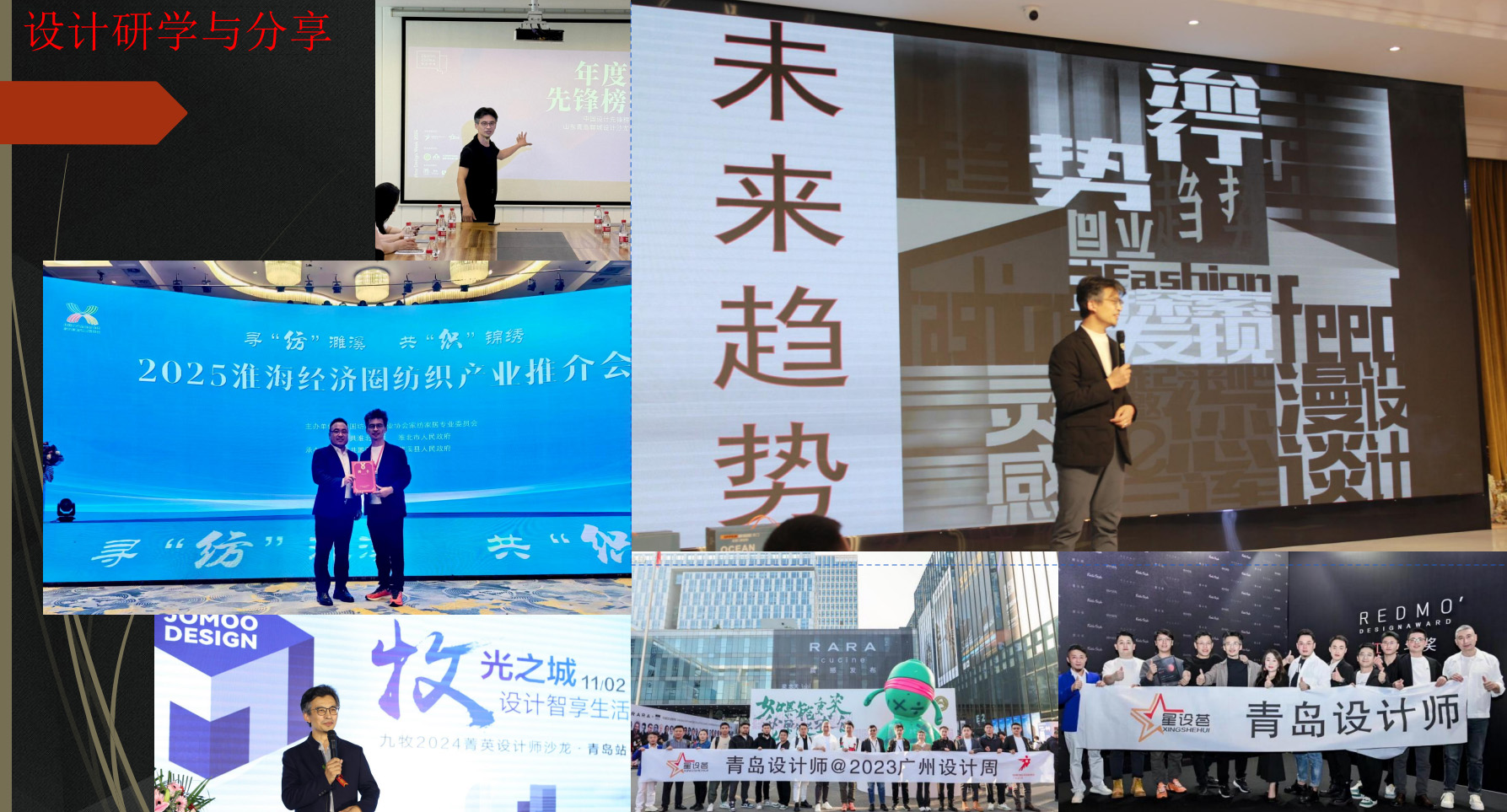——2019、2020、2021、2022、2023、2024年,连续主导和参与40UNDER40青岛思想会、山东启动礼、空间改造类设计奖项、设计师平台精英活动、艺术沙龙、产业游学、论坛、盛典、公益活动等数十场行业盛事。