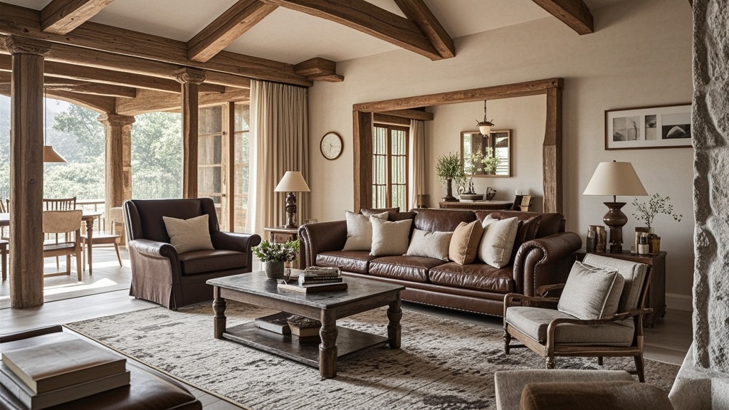 实木材质:大量使用实木作为主要的装饰材料,体现自然、朴实的风格。 石材运用:在壁炉、吧台等区域使用石材,增加质感和厚重感。 布艺元素:沙发、窗帘等常采用棉麻布料,提升舒适度。 家具特点