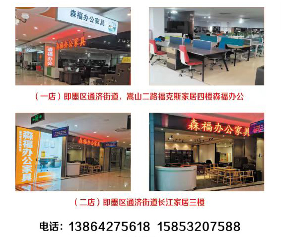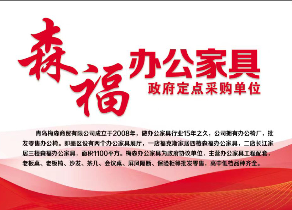 青岛梅森商贸有限公司,旗下有两个办公家具展厅,一店福克斯家居四楼森福办公家具,二店,长江家居三楼森福办公家具,面积1100个平方,办公家具政府协议单位,承接政府、医院、学校、酒店、等各种大中小企业的办公家具配套工程,及办公家具的批发零售,高中低档品种齐全。