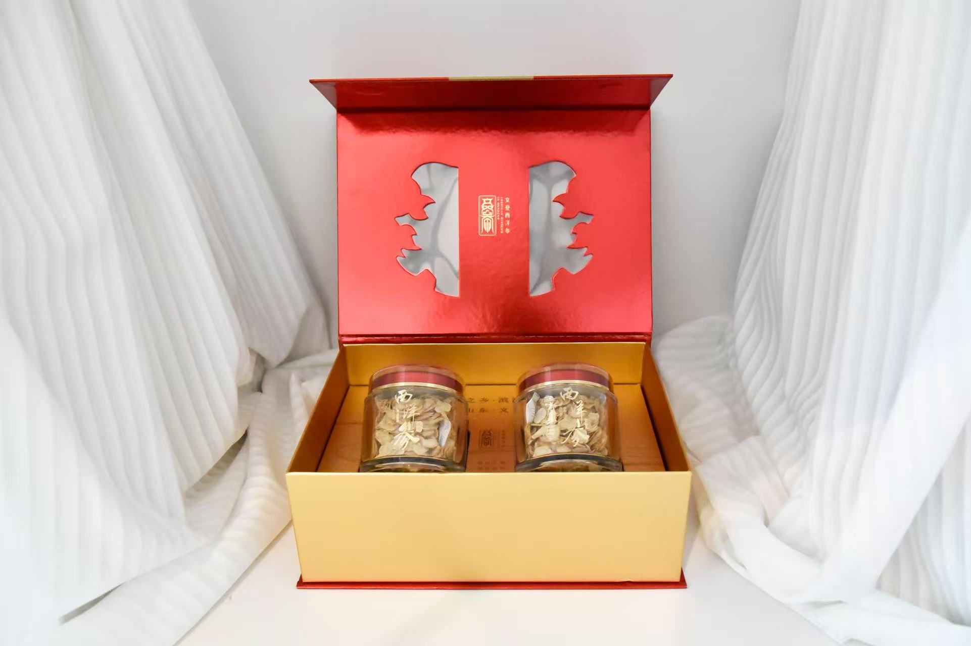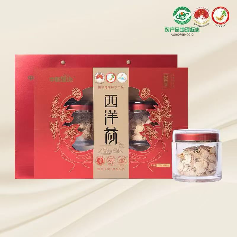 文登西洋参礼盒,精选高皂苷足龄文登西洋参片,主根切片,不提取、不熏硫,纹理清晰。 产自“中国西洋参之都”山东文登,与加拿大、美国产区同属北纬37°黄金生长带。礼盒设计精美,立体烫金,独立双罐包装。食用方式丰富,可煲汤、泡酒等。 作为国企出品的国家地理标志产品,获巴拿马万国博览会金奖,通过多项权威认证,农残0检出,人参皂苷含量高,安全优质。规格为65g×2瓶,保质期24个月,每日建议食用≤3克,孕妇、哺乳期妇女及14岁以下儿童不宜食用,也不宜与藜芦、五灵脂同用。
