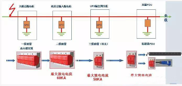根据GB50343-2012《建筑物电子信息系统防雷技术规范》规定,建筑物电子信息系统防雷等级分为A、B、C、D四个等级,根据防雷等级采取多级保护,逐级泄流降压最终使配电线路中的过电压(过电流)降到设备能承受的范围内。