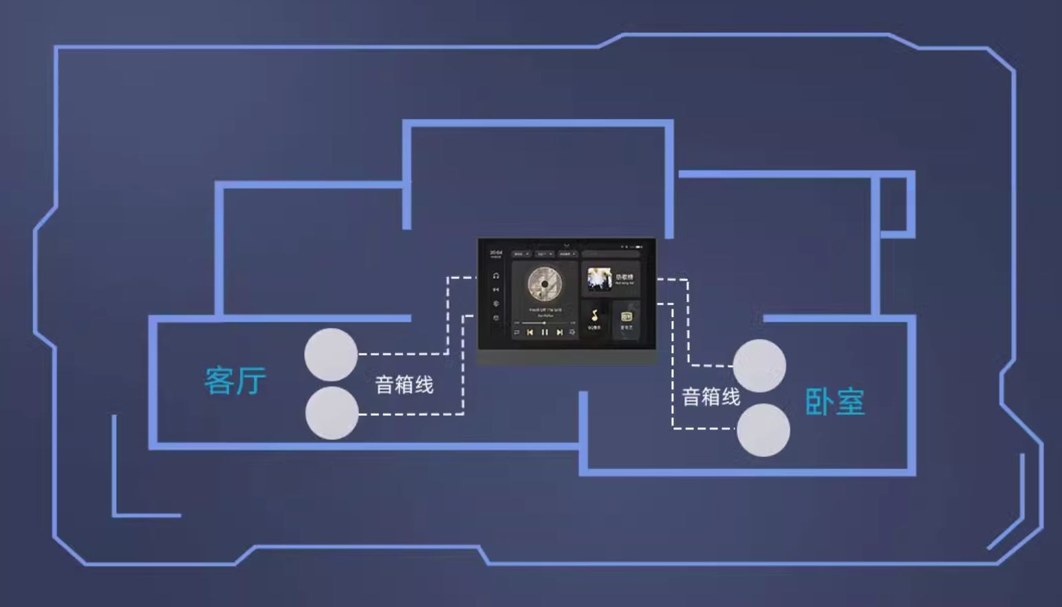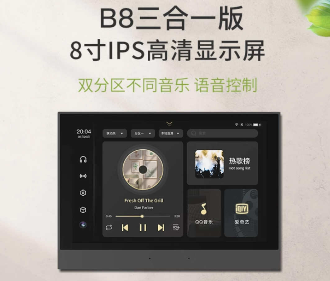 B8三合一,每个家庭音乐生活启动屏,双分区、语音控制、智能家居;语音+触屏,小孩老人都会用;智能配套,智能家居设备控制;独立双分区,播放不同音乐;海量音乐资源,百万咪咕音乐任你听;手机在外也能控制家里。