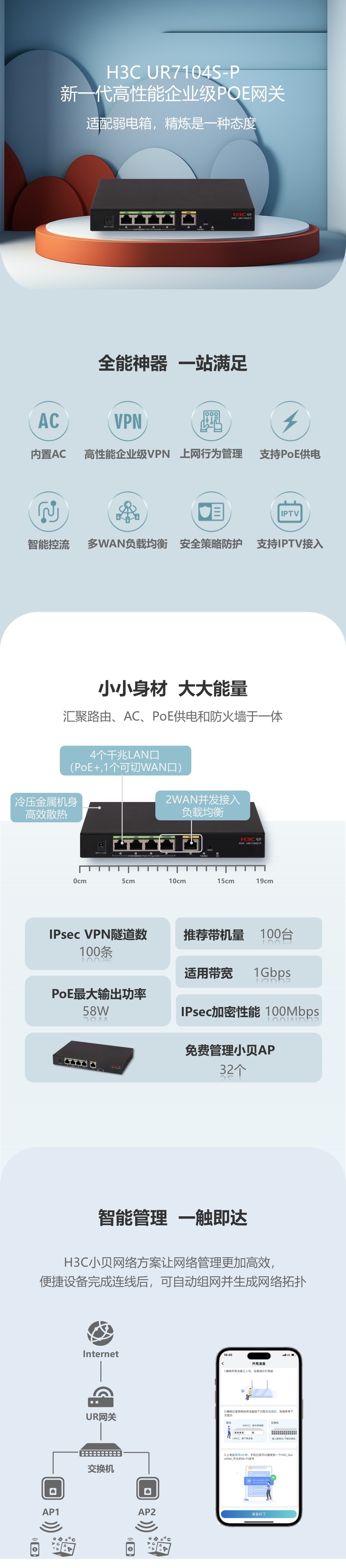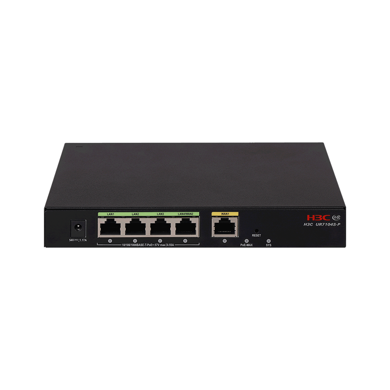 桌面式5口全千兆PoE路由器,固化5个千兆电口(含4个PoE口),推荐带终端数100台,推荐带宽1Gbps,整机PoE最大输出功率58W,单端口最大输出功率30W,内置AC功能,支持管理AP数32;支持IPSec VPN、L2TP VPN,支持固定IP地址、DHCP自动获取地址、PPPoE拨号等多种方式、支持短信、账号等多种接入认证方式,支持应用流控、应用阻断,支持云简平台与小贝APP管理