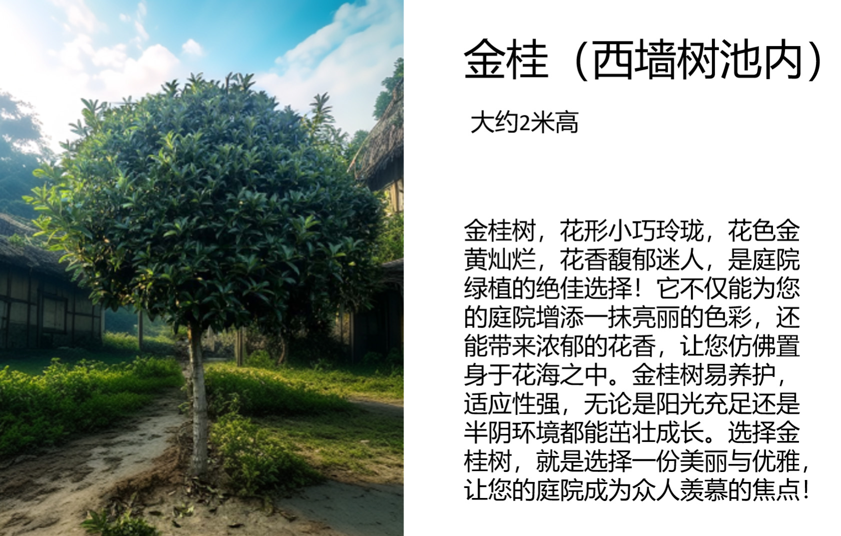 西面种植的金桂树簇拥在一起,金桂在中国文化里与财运相关。其浓郁的香气和繁茂的枝叶,象征着财运的旺盛,仿佛为庭院带来了源源不断的财富。