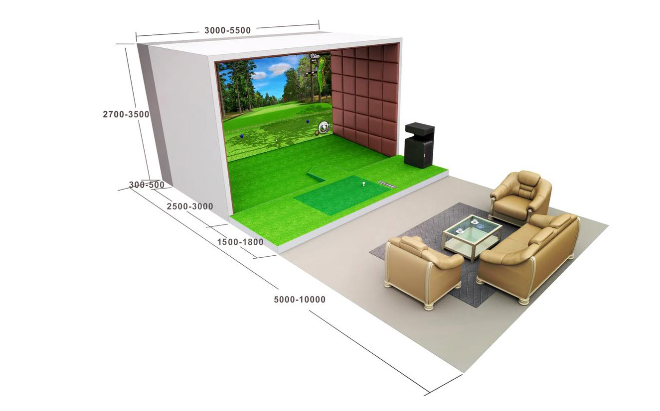 2、屏幕与投影系统屏幕:屏幕是室内高尔夫的核心视觉元素。屏幕的大小根据场地空间而定,常见的屏幕尺寸有3米宽×2米高到5米宽×3米高不等。屏幕的材质需要具备高清晰度、高对比度和良好的抗反光性能。例如,一些采用特殊涂层的投影屏幕,可以在室内光线较亮的情况下仍然清晰地显示高尔夫球场的画面。投影系统:投影系统负责将高尔夫球场的图像投射到屏幕上。高清投影仪是基本配置,其分辨率至少要达到1080p,以确保画面的清晰度。投影的亮度要足够高,一般在3000 - 5000流明之间,这样即使在有一定环境光的室内也能清晰地投影。此外,投影系统还需要具备准确的图像校正功能,以保证投影画面在屏幕上的比例和形状正确。